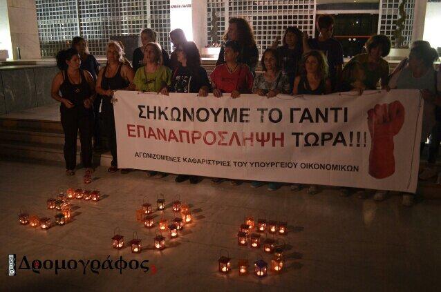 Με συνθήματα οι καθαρίστριες ζητούν την επαναπρόσληψή τους ενώ με κεριά έχουν σχηματίσει συμβολικά το νούμερο 595 που είναι ο αριθμός απολυμένων συναδέλφων τους.